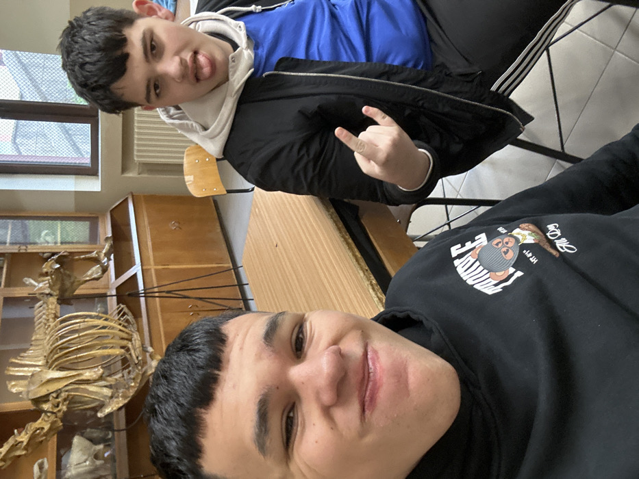 Two young males are present in an indoor setting, identified as a biology classroom or laboratory in Stara Zagora, Bulgaria. The subject in the foreground on the left, a male with short dark hair, smiles directly at the camera while wearing a black hooded sweatshirt adorned with a graphic of a cartoon bear. To his right, a second male with dark hair is seated, extending his tongue and displaying a "rock on" hand gesture with his right hand. He is dressed in a black bomber jacket over a light-colored hoodie and a blue shirt. In the background, a large, light-colored articulated animal skeleton is prominently displayed on a stand. Behind the skeleton are wooden cabinets with glass doors. Further back, a window with a dark frame reveals a blurred exterior view, and a white radiator is visible below it. Light-colored wooden desks and chairs are also present in the scene.
