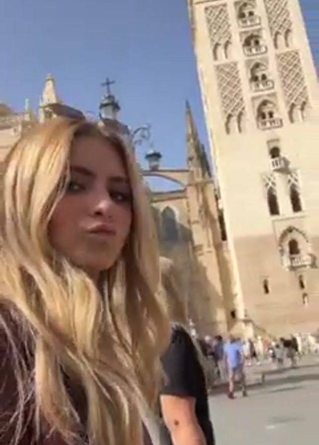 A young woman with long blonde hair stands in front of a tall, intricately designed tower under a clear blue sky. She is wearing sunglasses perched on her head, a white top, and a dark jacket. She looks directly at the camera with a slight pout. Another woman with blonde hair is visible in the background, partially obscured. The tower is light beige in color and appears to be part of a larger building complex with ornate details. Other people can be seen walking in the background.