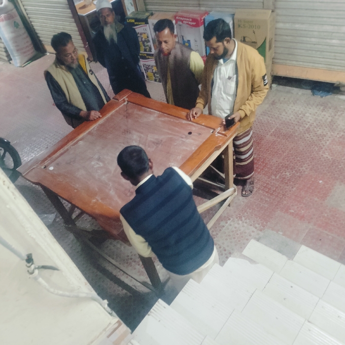 The image captures an indoor scene in Lalmohan, Bangladesh, featuring five adult males and a carrom game setup