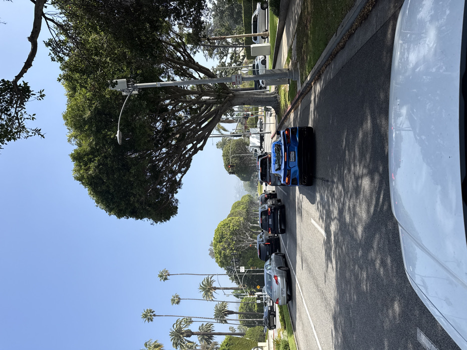This image captures a daytime street scene in Beverly Hills, California, United States of America, viewed from the interior of a light-colored vehicle. The camera is directed forward, showing a multi-lane asphalt road with vehicles stopped or moving slowly, suggesting congestion or a traffic light stop. The sky is clear and light blue, indicating fair weather. In the immediate foreground, the hood and a portion of the windshield of a white or silver vehicle are visible, from which the photograph was taken. Directly ahead, in the rightmost visible lane, is a blue Chevrolet C8 Corvette convertible with its top down, facing away from the viewer. Its California license plate is partially legible. To the left of the Corvette, in an adjacent lane, a queue of vehicles includes a dark-colored large SUV, followed by a black Audi SUV, and a silver sedan further behind. A white box truck is visible further down the road near a distant intersection. The road surface exhibits shadows cast by overhead trees. Both sides of the thoroughfare feature extensive, well-maintained green landscaping. A grassy median on the left is populated with numerous tall palm trees and other mature broadleaf trees. On the right, a sidewalk area is bordered by a large tree with dense, dark green foliage, which partially obscures the background. A utility pole, equipped with a street light and communication devices, stands on the right, displaying a white sign that reads "NO STOPPING ANYTIME." Traffic lights at a distant intersection appear red for the through lanes. Hills are visible on the horizon, slightly muted by atmospheric haze. No individuals are distinctly visible.