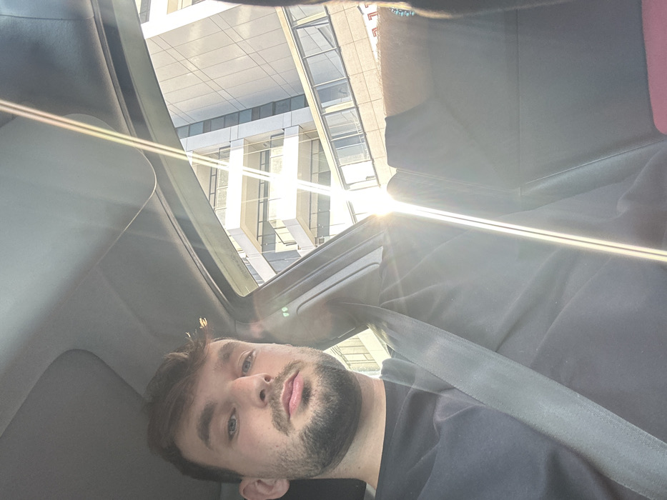 A selfie shows a man with short brown hair and a trimmed beard in a car