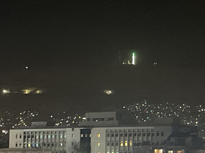 A night scene shows a cityscape with blurred lights and a few illuminated buildings. A prominent white building with multiple windows dominates the foreground. In the distance, a hill or mountain is visible, dotted with numerous small lights resembling a residential area. A tall, slender structure emits a green light at its peak, possibly a tower or minaret. A solitary bright spot is also seen in the dark sky. The overall atmosphere is dark and somewhat hazy.