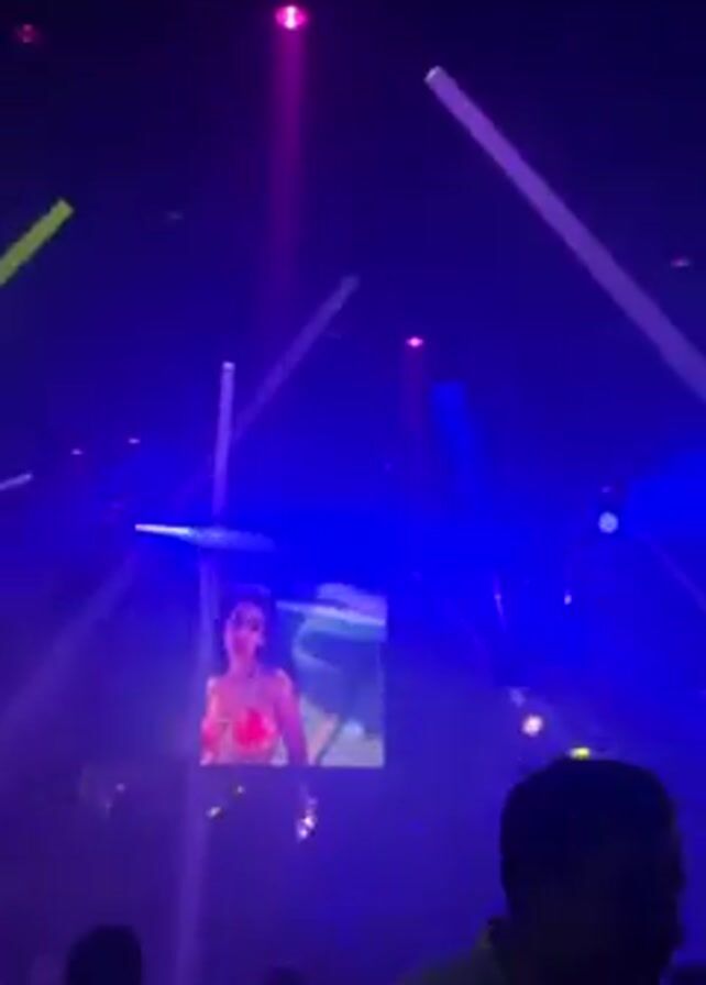 The video appears to be shot in a nightclub or bar. A DJ, a woman wearing a bright orange top, is visible behind a DJ setup, with a large screen displaying graphics behind her. Several people are partially visible in the foreground, facing the DJ. The venue is lit with dynamic lighting, including blue, purple, and yellow spotlights that move and crisscross the space. The atmosphere is dark and energetic, suggestive of a party or performance.