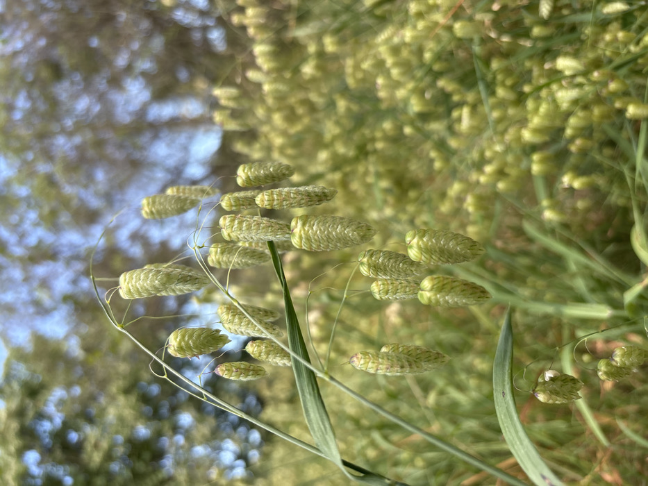 - "A close-up photograph displays a collection of *Briza maxima* (quaking grass) seed heads, characterized by their light green, ovoid, and layered structures, suspended from slender green stems" by FM-61Xqd2, licensed under CC BY 4.0