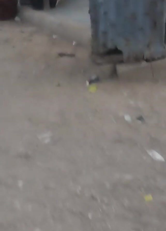 ground level view of a dirty, dusty area, possibly a yard or street. There is trash and debris scattered on the ground. As the camera moves, it reveals a person wearing a blue and green patterned garment. The person is bent over and appears to be cleaning or searching for something on the ground. The background includes a building or structure with a door and a window. The overall setting appears to be a low-income or impoverished area.