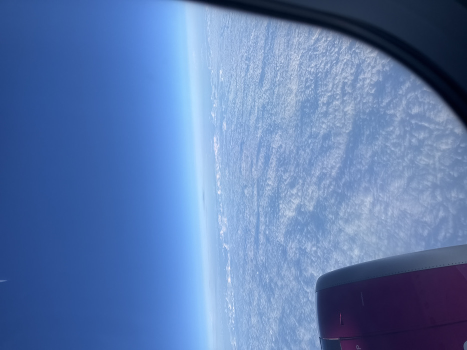 The image presents an aerial view captured from an aircraft window, looking out over an extensive layer of white, textured clouds