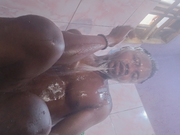 A person is showering, water cascading over their body and face. They are in a tiled bathroom with a window visible at the top. The individual wears a beaded bracelet on their wrist. Their eyes are closed, and they are smiling slightly. The image has a hazy, humid feel. Parts of the body, including shoulders and torso, are visible.