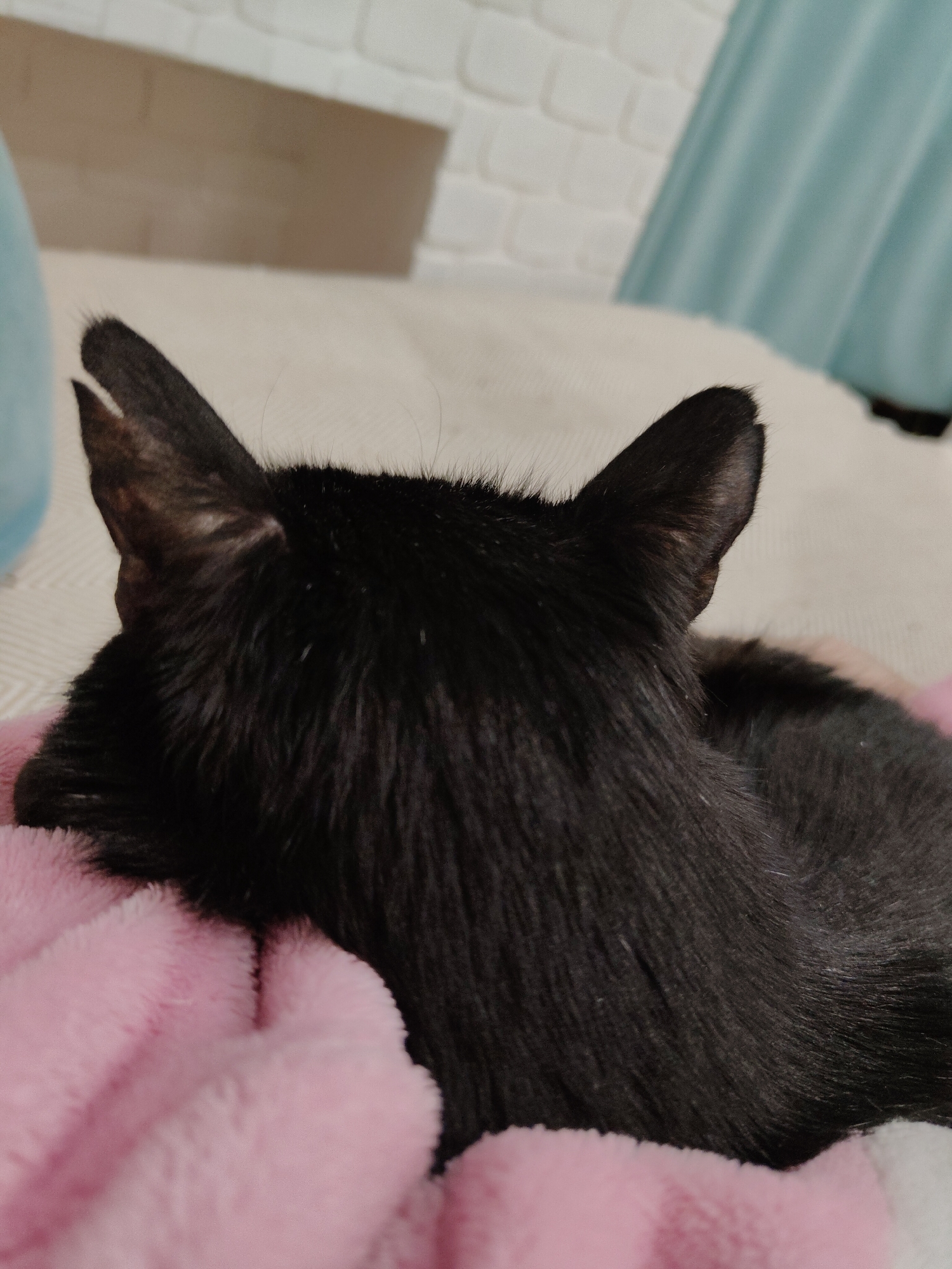 A close-up shot depicts the back of a black cat resting on a pink blanket. The cat's ears are prominent and point upwards. The background is blurred, but it appears to be a room interior with a white textured surface and a light blue object or fabric. The location is Unknown, Unknown.