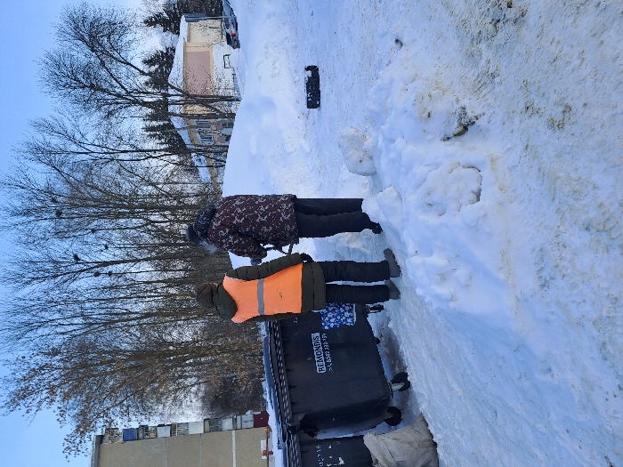 The image displays a winter scene in Saransk, Russia, under a clear blue sky. The ground is uniformly covered in snow, presenting uneven drifts and compact areas. In the midground, two individuals are positioned with their backs to the viewer. The person on the left is dressed in a dark jacket with an orange high-visibility vest worn over it, dark pants, and dark boots. The person on the right wears a dark, camouflage-patterned jacket, dark pants, and dark footwear, appearing to operate or observe a dark device mounted on a tripod. To the immediate left of these individuals are two large, dark grey wheeled garbage containers; the visible container displays the text "REMONTVs" and a partial phone number, along with a blue and white decorative pattern. A light-colored sack rests beside the leftmost container. On the far right, a dark object, possibly a bag or case, lies on a snowdrift. The background includes a multi-story apartment building on the far left. A dense grouping of bare deciduous trees, featuring numerous visible bird nests, occupies the central-right background. Beyond the trees, a light-colored, two-story building with a pink section is discernible, with several vehicles partially visible parked further in the distance.