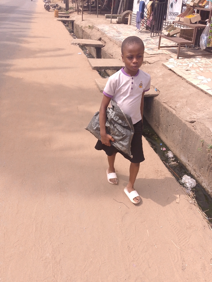 The image depicts an outdoor scene in Egbagu, Nigeria, specifically a street or market area during daylight hours. In the foreground, a young individual, appearing to be a child, walks on a light-brown, sandy-colored dirt path or unpaved sidewalk. The child wears a light-colored short-sleeved polo shirt with purple trim around the collar and sleeves, dark shorts, and white slide sandals. They are carrying a dark, possibly grey or black, crinkled plastic bag horizontally in front of their body with both hands. To the child's left (viewer's right), a concrete open drainage channel, or gutter, runs parallel to the path. This gutter contains stagnant dark water and various pieces of refuse, including plastic bags and other debris. Beyond the gutter, a more structured sidewalk with patterned tiling leads to commercial establishments. Visible elements include a wooden display stand holding cardboard boxes, possibly containing produce; metal security gates; various items hanging (potentially clothing); and other indistinct shopfronts or stalls. A yellow jerrycan is situated on the dirt road further back. To the child's right (viewer's left), a wider dirt road extends into the background, showing tire tracks. A motorcycle is parked on this road in the mid-ground. The overall environment suggests an active urban or semi-urban commercial street.
