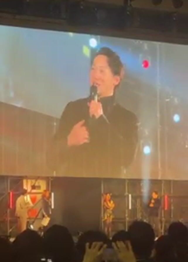A man speaks into a microphone on stage, visible on a large screen above an in-person audience. The man on screen is wearing a black turtleneck and gesturing while he talks. Below the screen, the stage is visible with several figures including one woman in a bright outfit with a black and gold patterned miniskirt. The audience is partially visible, with many people holding up phones to record. The room appears to be a large event space or auditorium with lighting rigs and scaffolding visible.
