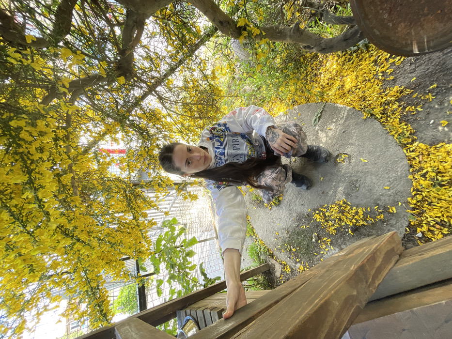 A young woman kneels on a circular stone surrounded by yellow blossoms. She wears patterned pants and a long-sleeved shirt with a printed graphic. The image is taken from a low angle, looking up past a wooden structure with a reaching hand, towards the woman. Yellow-flowered branches arc overhead, framing the scene. Some yellow petals are scattered on the stone and ground. A metal object is visible in the top right corner.