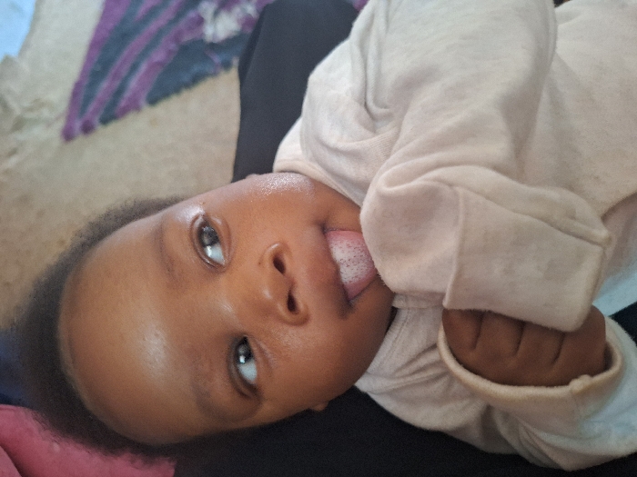An image captured in Sabon Tasha, Nigeria, shows a close-up of an infant. The infant, with dark skin and short, dark hair, is positioned facing forward and looking to the viewer's left with open eyes. Its tongue is partially extended from the mouth, displaying a white, frothy substance. The infant wears a light-colored, long-sleeved garment. A clenched fist is visible on the lower right, partially covered by the sleeve. A dark fabric object provides support for the infant on the left. The background reveals a patterned surface, possibly a rug or blanket, featuring cream, purple, and dark gray elements.