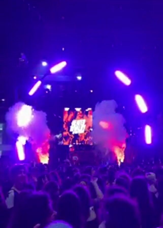 concert stage bathed in bright purple light. The performer is not clearly visible, but a large screen behind them displays "FISHER B2B MALAA" in stylized lettering. Smoke cannons are firing to the sides of the stage, releasing large puffs of white smoke. In front of the stage, a large crowd of people is gathered. Some are raising their hands in the air, appearing to be dancing and enjoying the music. The overall atmosphere is energetic and festive.
