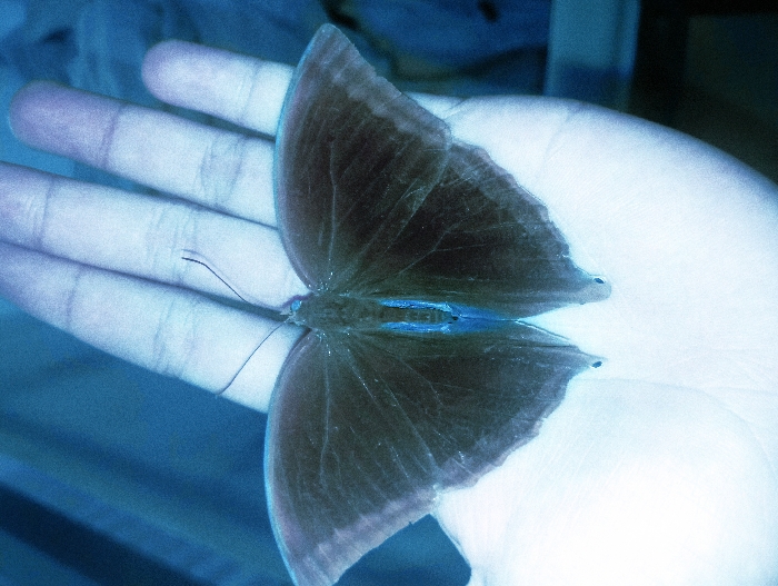 In Batulawang, Indonesia, a single image depicts a dark-winged butterfly at rest on an open human hand. The butterfly, observed with its wings spread flat, exhibits a predominantly dark brown or black coloration, accented by a distinct blue iridescence along its central body and potentially some wing veins, under a strong blue light source or filter. Its two antennae are visible, extending forward. The human hand, positioned palm-up with fingers extended, serves as the resting surface for the butterfly, occupying the lower half of the frame. The background is out of focus, appearing as an undifferentiated dark blue field. The entire scene is rendered with a pervasive blue monochromatic cast, affecting all visible elements.