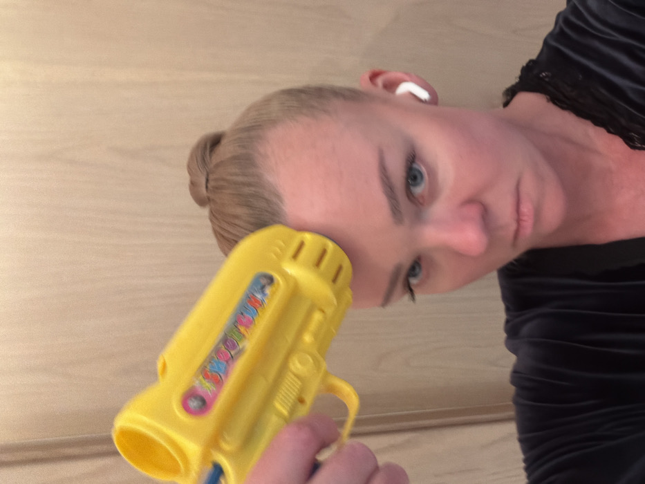 An adult female is depicted in a close-up, indoor setting within Vsevolozhsk, Russia. The background consists of a plain, light-colored wall with faint vertical lines, suggesting paneling. The woman has fair skin, blue eyes, and light-colored hair pulled back into a neat bun on top of her head. She maintains a direct, serious gaze towards the viewer. Her right hand is visible, holding a bright yellow plastic toy water gun, with the barrel end pressed against her forehead. The toy gun has multi-colored lettering on its side, partially visible, which spells "SQUIRTGUN." A white wireless earbud is present in her left ear. She is wearing a dark, possibly velvet or ribbed garment, with a black lace trim visible near her right shoulder/collar area.