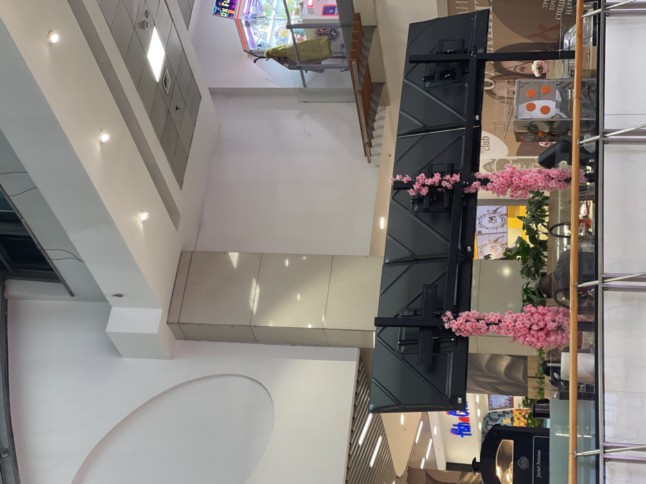 This image depicts the interior of a multi-level shopping mall in Sofia, Bulgaria. The perspective is from a lower floor, looking across an open space and upwards towards higher levels. In the midground, a large, dark-colored structure consisting of at least four interconnected flat-panel displays, mounted on a black metal framework, is suspended horizontally. The rear of these monitors is visible. Artificial pink cherry blossom garlands are wrapped around the vertical support poles of this display structure. Below this, a silver-colored metal and light wood railing runs horizontally, indicating a barrier at the viewer's level. Behind the railing, visible elements include: * On the left, a black oven-like appliance is present, partially obscured, with a sign reading "Jacket Potatoes." * Behind the oven, a bright blue sign for "Fish & Chips" is visible, along with text partially identifying "Asha Grill." * Several individuals are seated or standing in what appears to be a food court area. One person, seen from the back, wears a dark top. Another individual's head and shoulders are visible behind the "Jacket Potatoes" stand. * Green potted plants are arranged on counters. * On the far right, a large background advertisement poster features abstract patterns and a partial facial profile. Another piece of Cyrillic text is visible on a sign. The background shows the mall's architecture: * Predominantly white walls and ceiling structures with recessed circular spotlights and rectangular ceiling panels. * A tall, reflective, light-colored column extends from the lower to the upper level. * On an upper floor or mezzanine, a yellow-green jacket is hanging on a hook next to a transparent claw arcade machine, partially labeled "DX FUN," containing various prizes. This suggests an entertainment or gaming area. * Further back and higher up, dark windowpanes are visible. The environment is brightly lit by a combination of artificial overhead lighting. The overall scene is clean and modern, indicative of a commercial retail and entertainment complex.