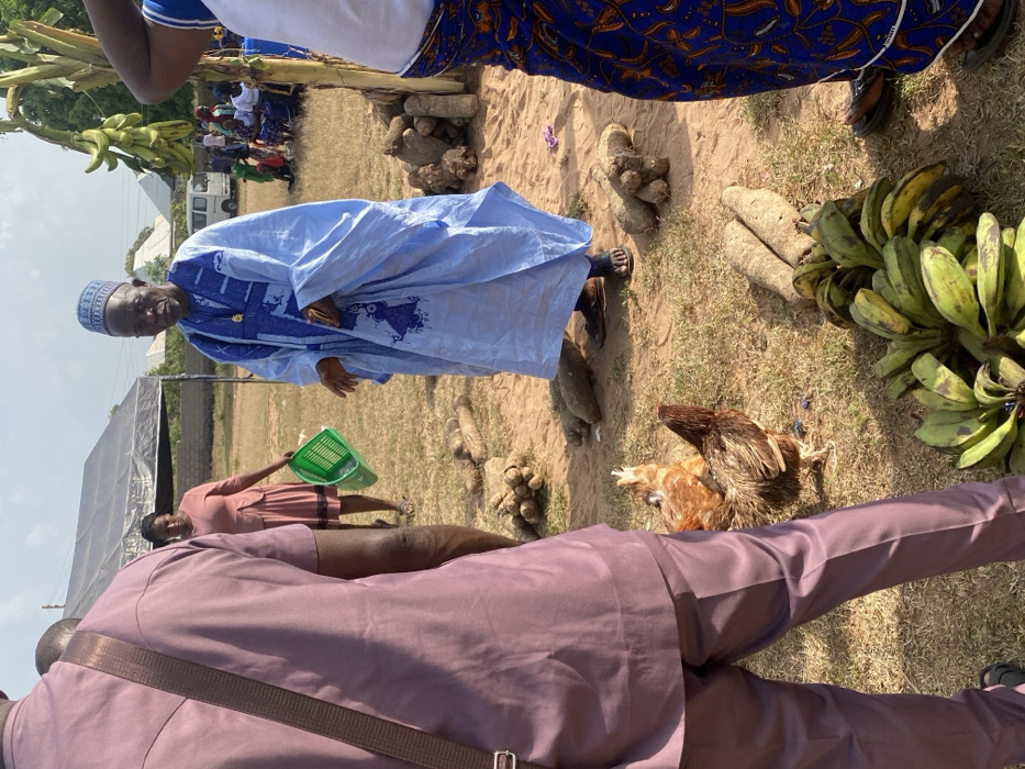 This image depicts an outdoor scene in Itobe, Nigeria, under a bright sky. In the foreground, the back of a person wearing a maroon-colored suit is visible on the left. To their right, two chickens, one reddish-brown and one dark brown, stand on dry, light brown ground. A large bunch of green and yellow plantains rests on the ground directly in front of the person in maroon. Several large, cylindrical yams are scattered across the mid-ground. In the center of the image, an older man with a beard, wearing a light blue and dark blue patterned caftan and matching cap, stands facing slightly left, with his hands open in a gesturing posture. Behind him and to the left, a woman in a pink dress walks away from the viewer, carrying a bright green plastic basket in her left hand. The background features a black canopy tent on the left. Further back, a white van is parked, and a group of people are seated under what appears to be another gathering point or tree. The ground throughout the visible area is dry and dusty.