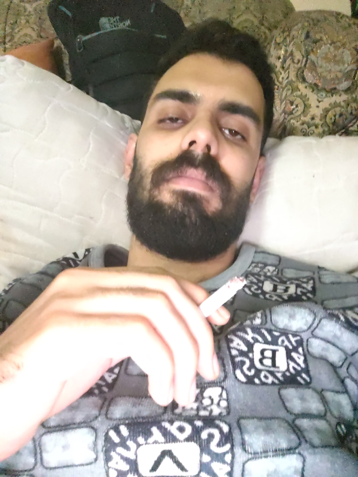A male individual, displaying dark hair, a full beard, and a mustache, is depicted in a close-up, upward-angled shot, suggestive of a selfie