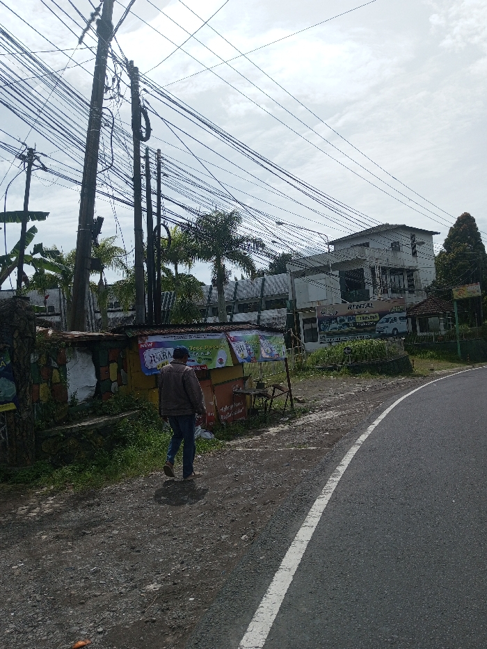 The scene depicts a street in Sandamal Eliya, Sri Lanka, under an overcast sky. In the foreground and mid-ground, a paved road with a solid white edge line curves to the right. To its left, a dirt and gravel shoulder accommodates a single male subject walking away from the camera. The man wears a brown jacket, blue jeans, and light-colored flip-flops. Adjacent to the dirt path on the left is a small, rectangular roadside stall featuring a corrugated metal roof and walls painted in colorful blocks (green, yellow, red, black, white). Several posters are affixed to the stall, displaying text including 'NEW', 'JUARA', and phrases resembling 'SEGER PERUT', indicative of Indonesian language. A dilapidated metal chair stands near the stall. Behind the stall and to its left, a low stone wall is partially visible with overgrown vegetation. Multiple utility poles rise from the ground to the left, densely strung with numerous overhead electrical and communication wires that crisscross against the sky. In the background, a multi-story white building with dark windows features a prominent 'RENTAL' sign and images of vehicles, suggesting a rental service. Palm trees and dense green foliage, including a tall conical tree on the far right, punctuate the landscape behind the buildings and stall.