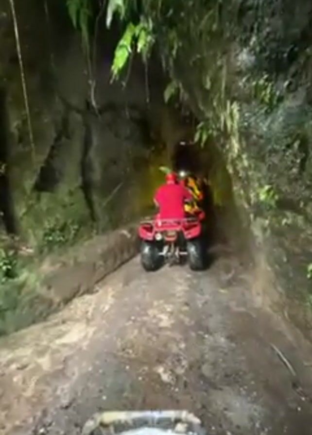 first-person perspective of someone driving a red ATV through a narrow, muddy tunnel. Another red ATV is in front, with a person wearing a red shirt and a helmet. Lush green vegetation covers the walls of the tunnel's entrance. The tunnel quickly darkens as the ATVs move deeper inside. Yellow light beams from the front ATV. The tunnel walls appear to be made of rock and earth.