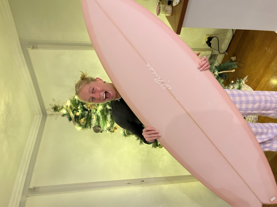 An indoor scene features a light-skinned female with blonde hair pulled back, standing centrally while holding a large, light pink surfboard horizontally across her body