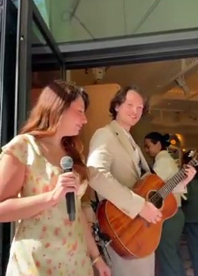 Two people, a woman and a man, are performing music. The woman, in a light yellow dress with pink and yellow floral patterns, holds a microphone. The man, in a light beige suit and vest, plays an acoustic guitar. They are standing outside a building with glass doors. Inside the building, a person wearing a green outfit can be seen. The weather appears to be sunny and the sky is visible in the background.