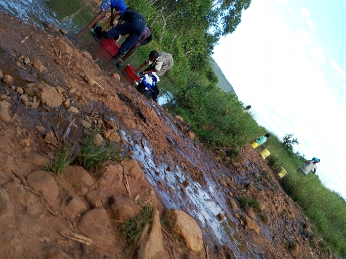 People do laundry by a river. Three individuals wash clothes near a red tub by the water. Others further down the river fill yellow buckets. The terrain is muddy, with some rocks and grass. The water flows over the muddy bank. In the background, green trees dot a hill under a partly cloudy sky.