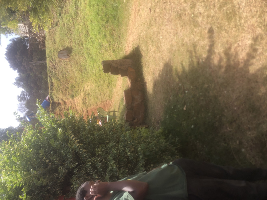 The image depicts an outdoor scene in Ngong ward, Kenya, under bright daylight with strong shadows. In the foreground on the left, a dark-skinned individual, likely male, is partially visible from the mid-torso to the upper thighs, facing right. He wears a green short-sleeved shirt and dark trousers. His left hand is raised to the side of his head, near his ear. Immediately to his right is a dense green leafy bush. Extending from the mid-ground towards the background is an ascending path of reddish-brown earth and sparse dry grass, flanked by green grass. To the right of the path, a low, L-shaped structure of rough reddish-brown stones or bricks is present. Further up the path and slightly to the left, a light green metal chair with an ornate backrest rests on a grassy patch. A weathered tree stump is visible on the grassy slope to the right of the path in the mid-background. The terrain slopes significantly upwards from the foreground towards the background. At the crest of the slope, partially obscured by distant trees, a blue object (possibly a barrel or container) is visible. The horizon is dominated by a dense line of dark green trees against a bright, hazy sky. In the far upper right, amidst the trees, rudimentary wooden structures or scaffolding are visible.