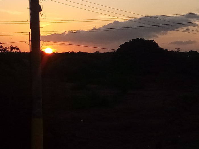 A low, bright sun sits on the horizon, partially obscured by dark clouds. Power lines stretch across the sky. A silhouetted tree line and dark foreground obscure the ground. A utility pole is on the left side of the frame. The sky fades from bright orange near the sun to a duller yellow above.