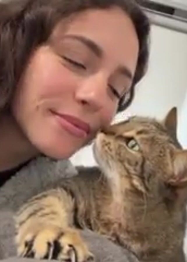 A young woman with long, curly brown hair is holding a tabby cat close to her face. The woman is wearing a gray, fuzzy sweater. She is smiling gently at the camera. The cat has green eyes and is looking up at the woman. The background is a plain white wall with a white door and a white air conditioning unit near the top of the frame.