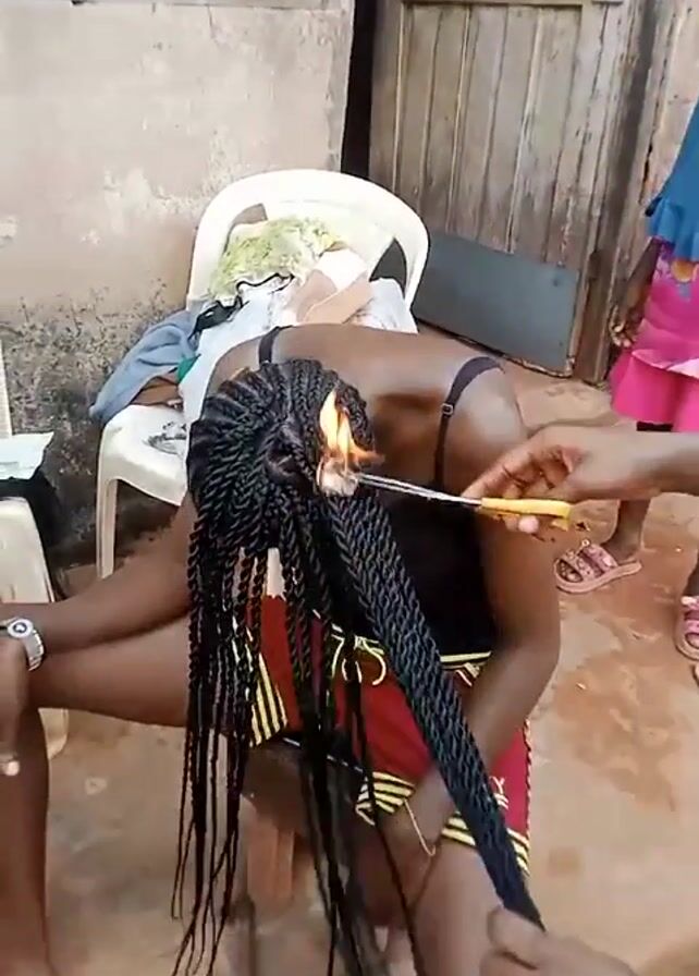 A woman with black braided hair sits outside on a white plastic chair with clothes draped over it. She wears a black tank top and red and yellow shorts. A person standing next to her is using a lighter to burn the ends of her braids. A young girl in a pink dress and blue hijab stands behind them. The scene is set in a courtyard with a concrete floor, a building with a window and a weathered door. A small package is on the ground near the seated woman.