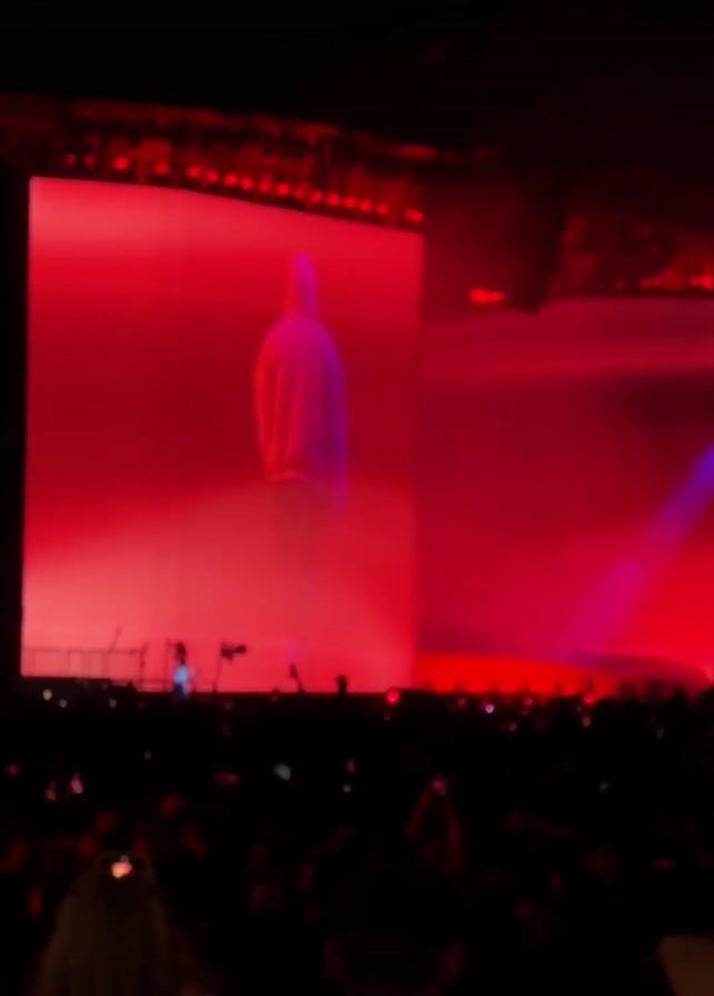 A blurry video shows a concert stage from the audience's point of view. On a large screen is the blurry image of a person wearing a hooded cloak. The screen is illuminated in red. There are a lot of people in the foreground, the audience, some with their phones up, taking pictures. The stage is also lit by a few red spotlights. There are some speakers and other stage equipment visible. The environment appears to be dark, as expected for a concert venue.