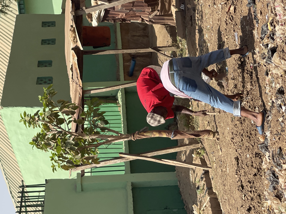 The image depicts an outdoor scene in Muchiya, Nigeria, under clear daylight with harsh shadows indicating direct sunlight. Two individuals are engaged in manual labor on a patchy, reddish-brown dirt ground. The primary figure, a man with dark skin, wears a red short-sleeved shirt and a beige and brown plaid newsboy-style cap. He is bent at the waist, facing right, holding a tool, possibly a hoe or pickaxe, with both hands, positioned towards the ground. To his immediate right and slightly in front, a second individual is seen from behind, also bent at the waist. This individual wears light blue jeans with rolled cuffs, a light-colored shirt, and blue slide sandals on bare feet. A green belt is visible around their waist. Both individuals appear to be actively working or digging in the soil. In the mid-ground, positioned between the two individuals and a background structure, stands a young tree with sparse green foliage. Its trunk is partially wrapped in fabric and supported by two wooden stakes. The immediate foreground shows an accumulation of refuse, including white and black plastic bags. The background features a light green building with a visible ribbed roofline. A dark green metal fence runs along the base of this building. Higher on the building's wall, four small, dark, rectangular openings are present. To the right of the tree, a makeshift structure with a rusty, corrugated metal roof is visible, supported by wooden posts. Underneath this roof, an orange barrel-like object hangs, and a blue pipe protrudes from a lower section of the wall. Additional corrugated metal sheets form part of this structure's side.