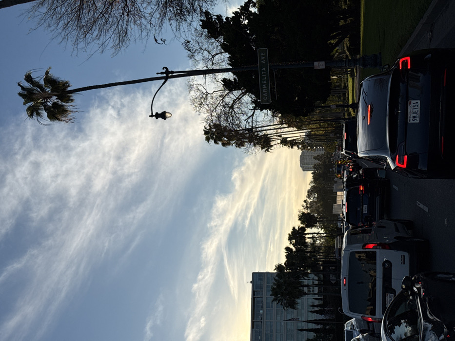A palm tree and a street lamp stand tall against a blue sky streaked with wispy clouds. Cars are lined up in traffic, including a black Tesla with California license plate 9MJE754. A street sign reads "Carmelita Ave." Buildings are visible in the background, framed by rows of palm trees. Some bare branches of other trees are visible above the palm trees.