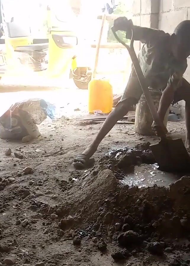 A young person is using a shovel to mix what appears to be mud or concrete in a pit. The scene takes place indoors, with a brick wall visible on one side and a cluttered area on the other. The person is wearing shorts and a patterned shirt. The lighting is bright, and the overall environment seems to be a construction or work site.
