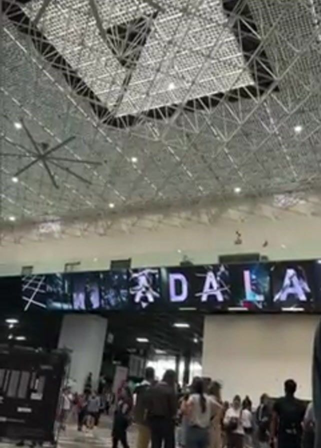 wide indoor space with a high, intricate ceiling made of crisscrossing metal beams, with a design resembling a large square in the center. Below, there's a digital sign displaying "GUADALAJARA" in large, illuminated letters that transition to other words. Many people, dressed in casual attire, are milling around, walking in different directions. Some are standing in small groups, and a few are looking at their phones or carrying luggage. The floor is covered with light-colored tiles, and a wheeled luggage cart is visible in the lower left of the frame.