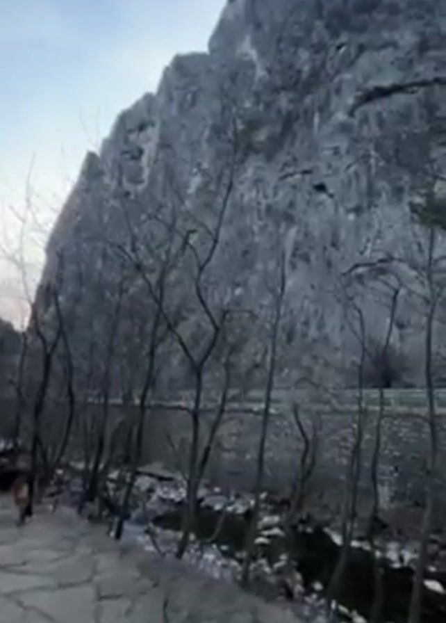A low-angle shot follows a German Shepherd walking along a stone path. To the dog's right is a river, partially obscured by trees, and a large, gray, rocky mountain. The sky is a pale blue, indicating either early morning or late afternoon light. The trees are bare, suggesting winter or early spring. The path is made of irregular stone slabs.