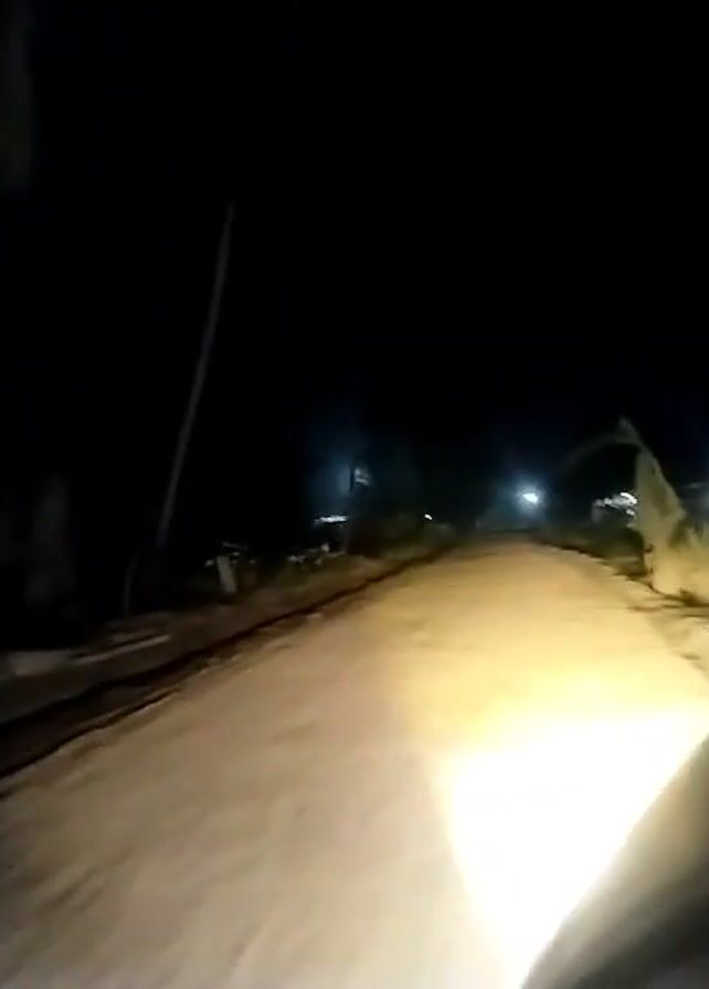 first-person perspective of someone driving down a dirt road at night. The road is illuminated by the vehicle's headlights, and there are occasional streetlights in the distance. The surrounding environment is dark, with some trees and structures visible on either side of the road. The camera is shaky, indicating movement, and there are no other people or vehicles visible in the frame.