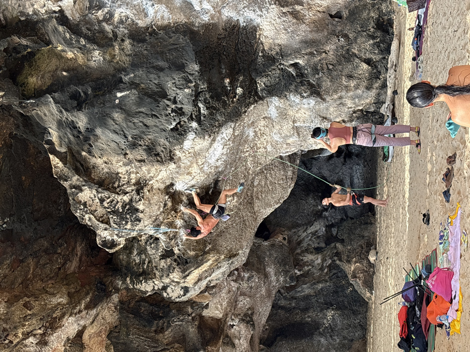 The scene depicts an outdoor rock climbing activity on a sandy beach at the base of a large limestone cliff formation, identified as being in Ban Ao Nang, Thailand. In the upper central portion of the image, a shirtless male climber, wearing dark shorts and light blue climbing shoes, is actively ascending an overhanging section of the rock face. He is secured by a climbing rope that extends from his harness upwards through several quickdraws affixed to the rock. His body is horizontal, with his left hand gripping a hold and his left foot placed on the rock. Below the climber, on the sandy beach, three individuals are present. In the mid-ground, a female stands facing away from the viewer, looking upwards at the climber. She wears a reddish-brown crop top, light-colored striped pants, and a climbing harness, and is actively managing the green climbing rope. To her left, a shirtless male, wearing dark shorts and a climbing harness, also stands looking up and holding the climbing rope. In the bottom right foreground, a third individual, female, with dark, wet hair pulled back, is seen from behind, holding a small green towel. The sandy ground in the foreground is covered with an assortment of climbing equipment and personal items, including backpacks, clothing (red, pink, yellow), a striped mat, and brown sandals. The rugged limestone cliff face displays a textured surface with varied shades of dark grey, brown, and light beige. The scene is illuminated by strong natural light, casting shadows from the rock overhang and individuals.