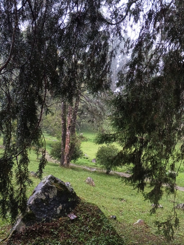 A serene landscape reveals a grassy meadow dotted with small bushes and a winding path. Overhanging branches with lush greenery frame the scene, partially obscuring the view. A large, moss-covered rock sits in the foreground. In the background, trees stand shrouded in mist, giving the scene a tranquil and somewhat mysterious atmosphere.
