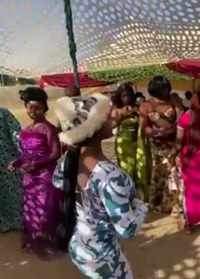 group of women dancing under a white tent with colorful decorations. One woman in a white and blue patterned dress and a unique feathered hat is in the foreground, actively dancing with energetic movements. The other women are wearing various colorful dresses and some are also dancing. The ground appears to be sandy or dusty, and the overall atmosphere is festive.