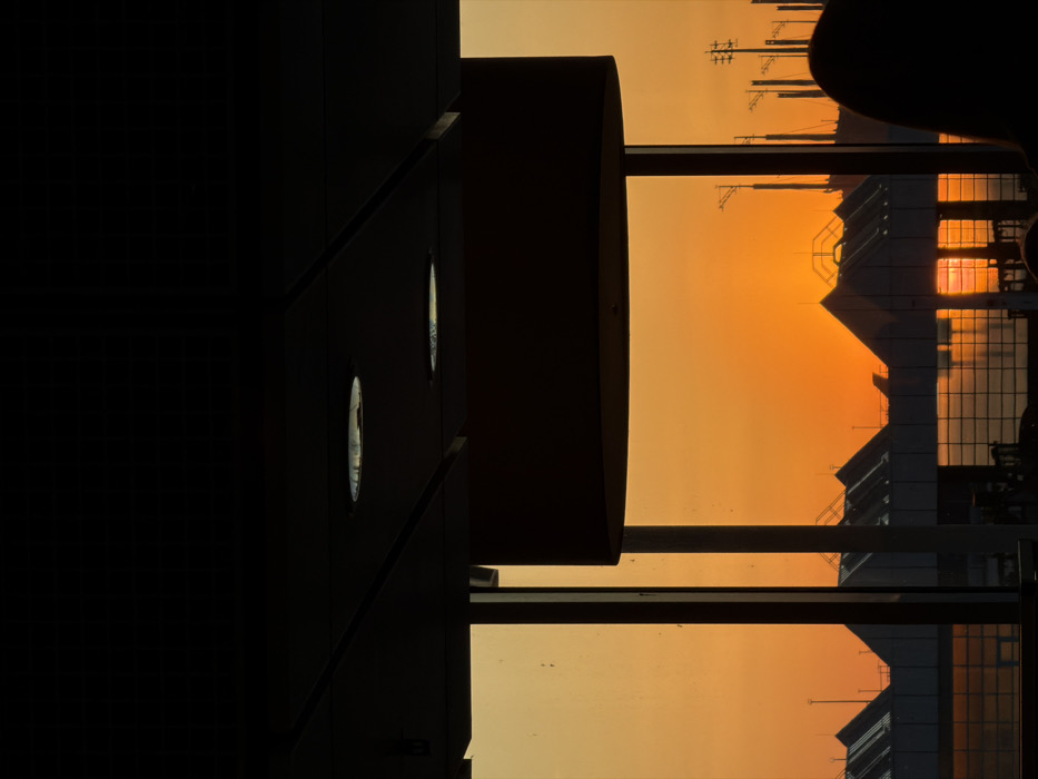 This image captures a high-contrast, silhouetted view from an interior space looking out over an airport terminal at sunset or sunrise, located at Munich Airport (MUC) in Oberding, Germany. The upper portion of the frame features a dark, paneled ceiling with two recessed circular lights reflecting ambient light. A large, dark, cylindrical lampshade hangs centrally, partially obscuring the view. Dark vertical structural elements, consistent with window frames, divide the scene. Beyond the window, a vibrant orange and yellow sky dominates the background. Silhouetted against this bright sky are multiple airport terminal buildings with distinctive peaked or ridged roofs. The glass facades of these structures reflect the low-angle sunlight, appearing as bright patches of orange. Numerous tall, slender poles or structures, possibly for lighting or communications, are visible extending upwards from the terminal area. In the lower right foreground, the dark silhouette of a person's head and shoulder is partially visible, indicating an observer within the interior space. The overall environment suggests a waiting area or lounge within the airport.