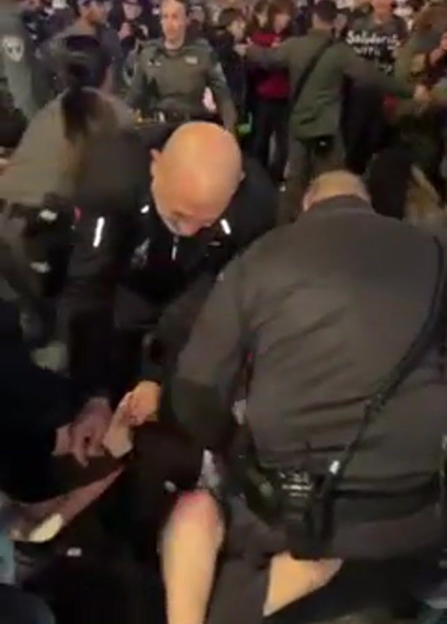 nighttime scene with a crowd of people, some of whom are wearing uniforms. Several uniformed individuals are surrounding a person on the ground and appear to be restraining or arresting them. The person on the ground is wearing a brown jacket and a white shirt. The surrounding environment includes what seems to be a street or public area with buildings visible in the background. The atmosphere appears tense and chaotic, with multiple people in close proximity and active movements.