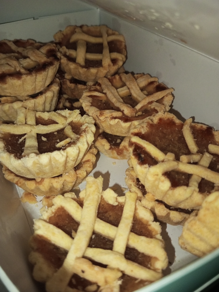 - "The image displays a quantity of small, round tarts with lattice tops, contained within an open, light-colored box" by FM-3UYEz1, licensed under CC BY 4.0