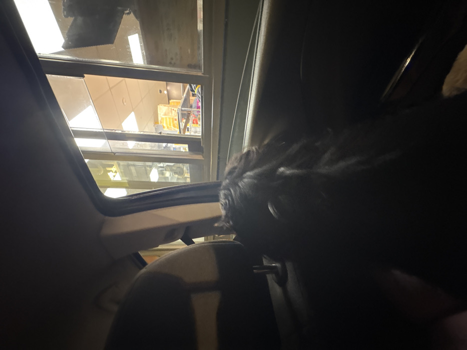 An interior car view captures a drive-through window at night