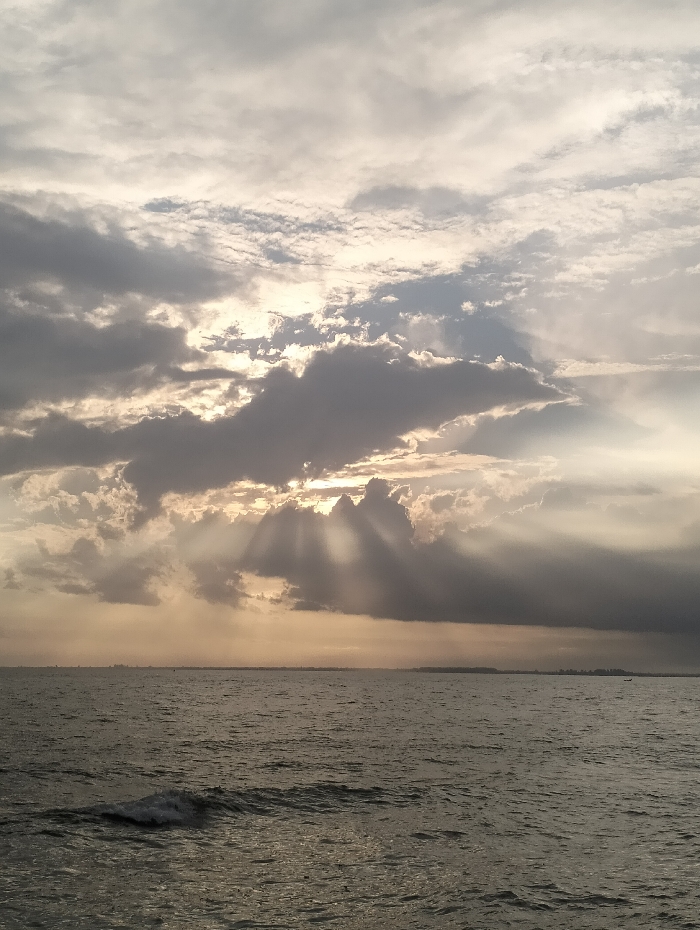 The image portrays a seascape under a dramatic sky. Sunlight streams through gaps in the heavy, layered clouds, casting visible rays onto the water's surface. A distant coastline is faintly visible on the horizon. The sea itself is choppy with small waves catching the light. The overall tone is muted, dominated by grays, whites, and hints of gold from the sun.