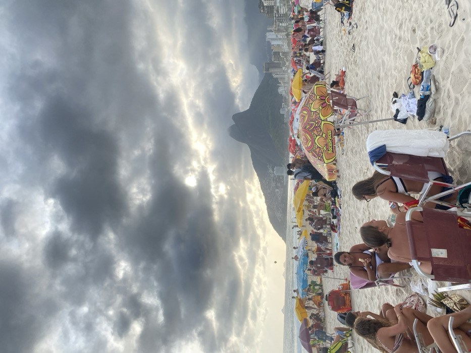 A beach scene under a cloudy sky features a prominent mountain silhouette in the background. Beachgoers relax in chairs under colorful umbrellas along the sandy shore. The lighting is subdued with the sun partially obscured by clouds, casting a soft glow on the scene. Tall buildings can be seen in the distance.