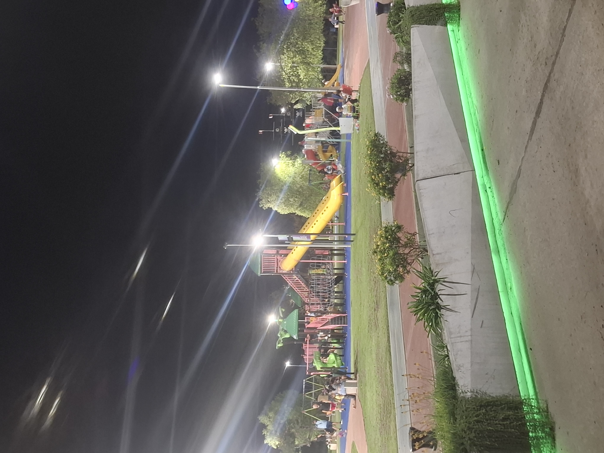 Here is a description of the image: The image depicts a playground at night, likely located in Villa Domínico, Argentina, judging from the provided context. The playground features various structures, including slides, climbing frames, and swings. There are people visible in the playground area, suggesting it is in use despite the time of day. Streetlights illuminate the playground, and there is decorative green lighting on a nearby concrete structure. There are also trees and plants present, indicating a park or recreational area. The image shows some light streaks from streetlights, and the sky is dark. The concrete area with green lighting is to the right of the playground. A pathway runs through the playground parallel to the concrete structure.