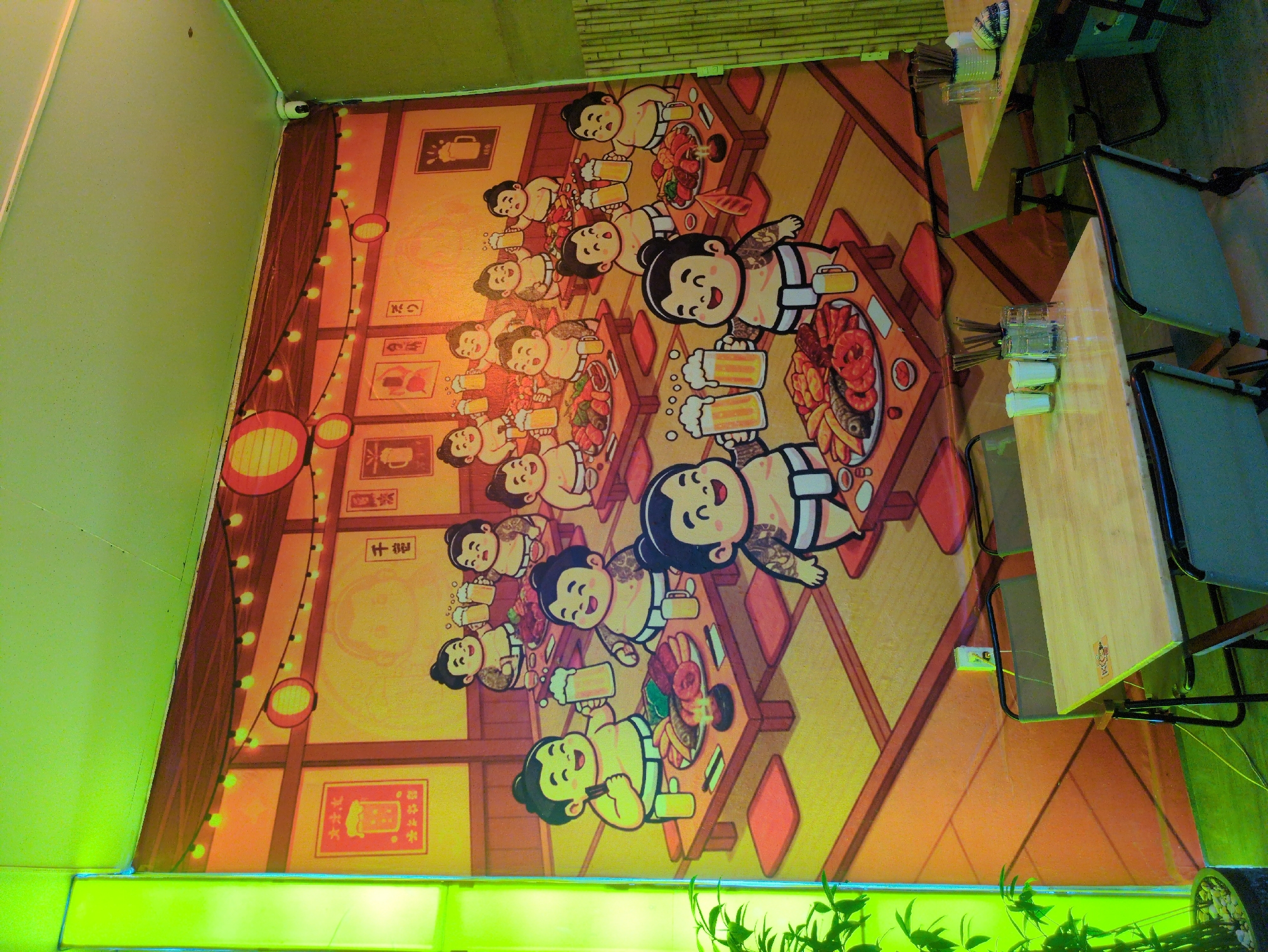 The image captures a restaurant interior in South Quy Nhon Ward, Vietnam. A yellow-toned wall mural depicts cartoonish sumo wrestlers drinking beer and eating food at tables. The mural includes string lights and illustrations of beer-related imagery. Wooden tables with metal-framed chairs are arranged adjacent to the mural, with glasses and cutlery set on the tables. The environment appears to be illuminated by a green light source, giving the bottom portion of the image a green hue. Some greenery is present in the foreground.